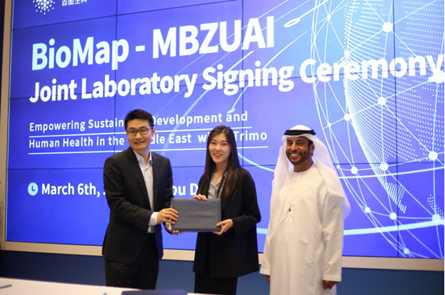 The signing ceremony was attended by Jiarun Qu, Vice President of Strategic Development of BioMap, and Dr. Kun Zhang from Mohamed bin Zayed University (MBZUAI). During the ceremony the two organizations introduced their collaboration roadmap, and BioMap shared the technical progress made with its xTrimo model system and its strategic development plan for the Middle East.