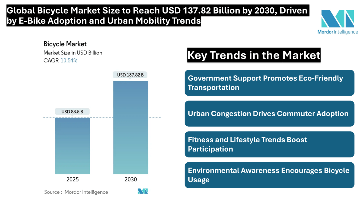 The global bicycle market size is estimated at USD 83.50 billion in 2025 and is expected to reach USD 137.82 billion by 2030, growing at a CAGR of 10.54%. Growth is supported by urban congestion policies, corporate wellness initiatives, government investments in cycling infrastructure, rising fuel costs, and technological advancements in battery safety. Direct-to-consumer brands, software-enabled fleet services, and e-bike innovations are transforming the market landscape, making bicycles an increasingly viable and sustainable transportation option.