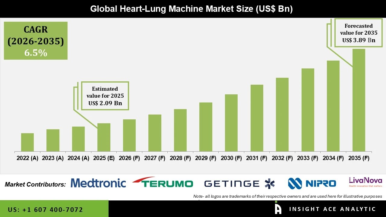 InsightAce Analytic Pvt. Ltd. announces the release of a market assessment report on theGlobal Heart-lung Machine Market Size, Share & Trends Analysis Report By Product Type (Capital Equipment [Heater-Cooler Units / Heat Exchange Systems, Monitoring Systems, Pumps, Others] and Consumables [Oxygenators {By Product (Membrane Oxygenators, Pediatric/Neonatal Oxygenators, ECMO Oxygenators, Other Oxygenators), By Age Group (Adult, Pediatric)}, Cannulas {By Product (Venous Cannulas, Arterial Cannulas, ECMO Cannulas, Cardioplegia Cannulas, Vent Cannulas), By Age Group (Adult, Pediatric)}, Blood Reservoirs & Filtration Systems, Accessories & Consumables, Tubing Sets & Circuits]), Application (Heart Valve Surgeries, Coronary Artery Bypass Grafting (CABG), Lung Transplant, Heart Transplant, and Others), End-user (Private Healthcare Institutions and Public Healthcare Institutions),-Market Outlook And Industry Analysis 2035″