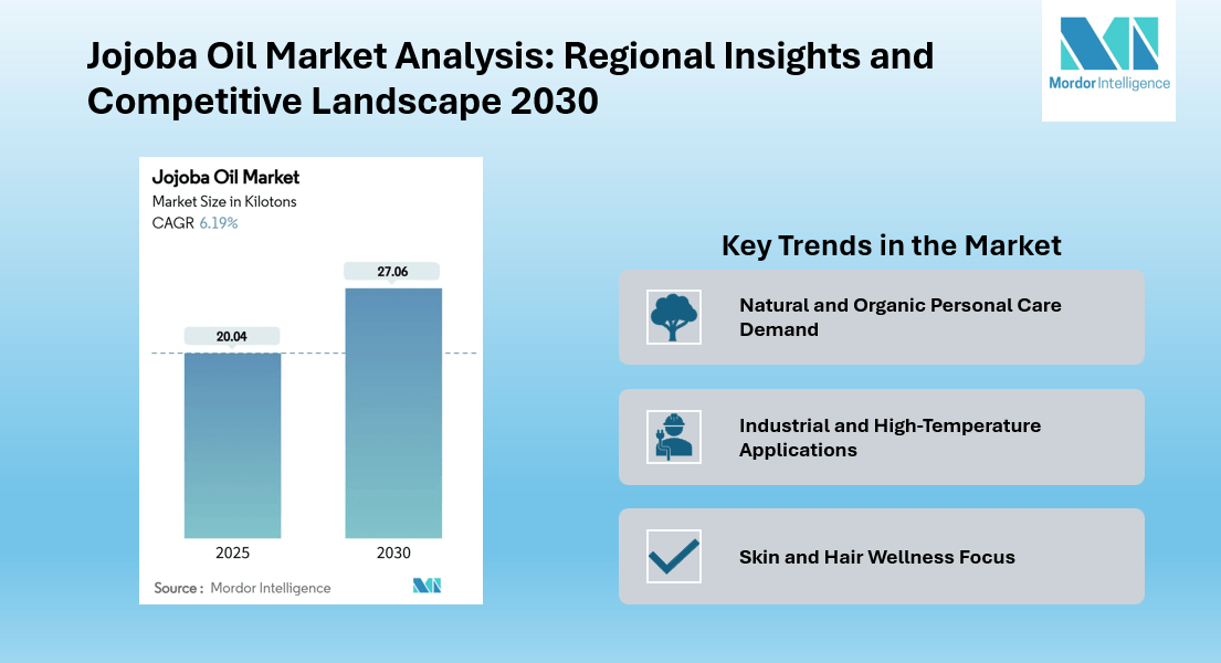 The global Jojoba Oil Market is estimated at 20.04 kilotons in 2025 and projected to reach 27.06 kilotons by 2030, reflecting a CAGR of 6.19% during the forecast period. The market’s expansion is supported by rising consumer awareness of natural and clean-label personal care products, alongside emerging industrial applications of jojoba oil as a biodegradable high-performance lubricant.
