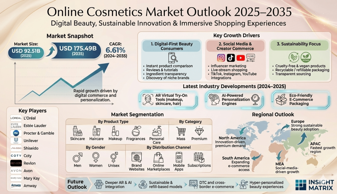The Online Cosmetics Market has experienced significant growth in recent years as digital transformation reshapes how consumers purchase beauty products. With the rise of e-commerce platforms, mobile shopping, and social media influence, cosmetic brands are increasingly shifting their sales strategies toward online channels. According to industry projections, the Online Cosmetics Market size is expected to reach USD 92.51 billion in 2025 and grow to USD 175.49 billion by 2035, registering a compound annual growth rate (CAGR) of 6.61% during the forecast period from 2025 to 2035. The market analysis includes revenue forecasts, competitive landscape evaluation, key growth drivers, and emerging trends shaping the digital beauty ecosystem.