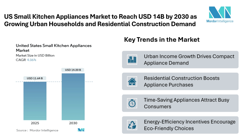 According to Mordor Intelligence, the US Small Kitchen Appliances Market size is valued at USD 11.64 billion in 2025 and is forecast to reach USD 14.20 billion by 2030 on a 4.06% CAGR.